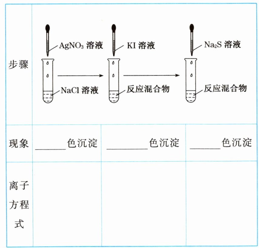白 黄 黑 C1(aq)+Ag+(aq)=AgC1(s) AgCl(s)+I−(aq)AgI(s)+C1−(aq) 2AgI(s)+S²−(aq) Ag2S(s)+2I(aq)