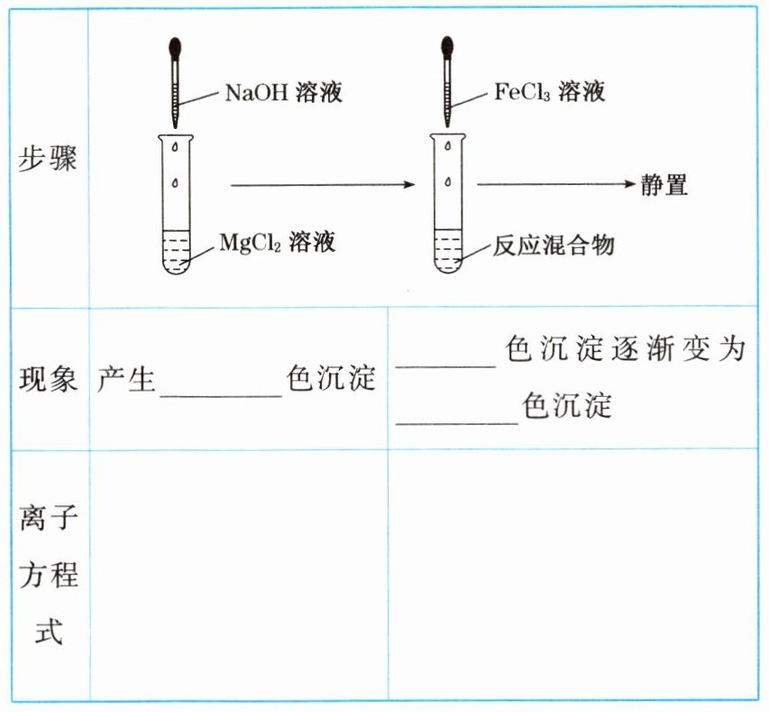 白 白 红褐 Mg2++2OH−Mg(OH)2↓ 3Mg(OH)2(s)+2Fe²+(aq)2Fe((OH)3(s)+3Mg2+(aq)