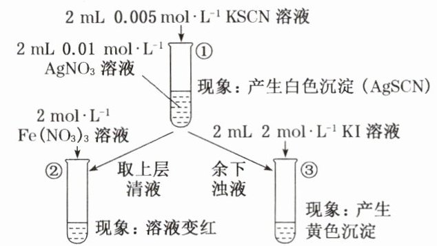 C ①中生成的白色沉淀为AgSCN,在溶液中存在沉淀溶解平衡,则有AgSCN(s)Ag+(aq)+SCN.(aq),故A正确;取上层清液,加入Fe(NO)3溶液,溶液变红,说明上层清液中含有SCN,故B正确;因在①中AgNO过量,余下的浊液中含有过量的Ag+,与KI反应生成黄色沉淀,不能证明AgSCN 转化为AgI,即不能证明Ag1比AgSCN更难溶,故C错误;Ag+与I结合生成AgI黄色沉淀,③中颜色变化说明有AgI 生成,故D正确。