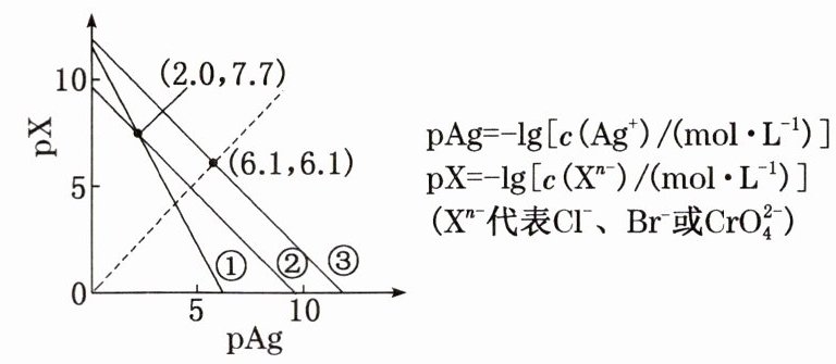 2. $(2024\cdot黑、吉、辽卷)$$25\ ^{\circ}\text{C}$下,$\text{AgCl}$、$\text{AgBr}$和$\text{Ag}_{2}\text{CrO}_{4}$的沉淀溶解平衡曲线如下图所示。某实验小组以$\text{K}_{2}\text{CrO}_{4}$为指示剂,用$\text{AgNO}_{3}$标准溶液分别滴定含$\text{Cl}^{-}$水样、含$\text{Br}^{-}$水样。