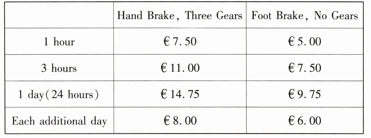 22.C 数字计算题 [解析]根据Prices部分的表格内容可知,租一辆带手刹和三个档位的自行车一天需要14.75欧元,每多租一天需要额外支付8欧元。所以租一辆带手刹和三个档位的自行车两天需要付(14.75+8=)22.75欧元。故选C。
