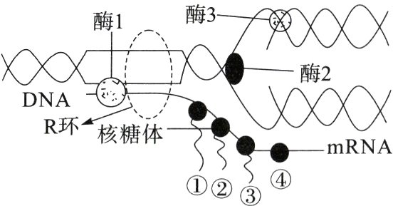 12.(多选)(2024·湖南郴州模拟)当某些基因转录形成的mRNA分子与模板链未分离时,会形成RNA - DNA杂交体,此时非模板链、RNA - DNA杂交体共同构成R环结构,R环结构会影响DNA复制、转录和基因的稳定性。如图是某细胞中遗传信息的传递和表达过程的示意图。下列说法错误的是( )