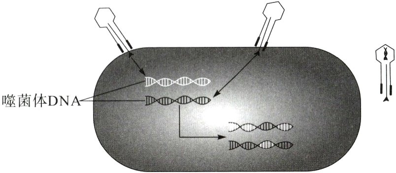 11.(2024·河北邢台质检)若T2噬菌体中双链DNA分子的某一片段发生突变,则会使其丧失产生子代DNA的能力。甲、乙均为DNA某一位点发生突变的T2噬菌体,甲与乙同时感染大肠杆菌后有少量子代噬菌体产生。已知噬菌体成对侵染细菌时DNA会发生如图所示的过程。下列分析正确的是 ( )