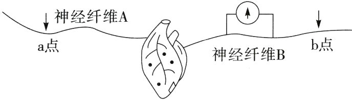 A 由题干“刺激a点,蛙心的心率加快,刺激b点,蛙心的心率下降”可知,两条神经纤维均为传出神经,神经纤维A是交感神经,A错误;兴奋在神经纤维上以电信号的形式进行传导,当神经纤维受到适宜强度刺激后,引起Na⁺内流,从而使膜电位变为外负内正引发兴奋,B正确;刺激a点导致心率加快,该过程存在电信号到化学信号再到电信号的转变,C正确;刺激b点,信号可以传导到心脏,因此电流计指针可发生两次方向相反的偏转,D正确。