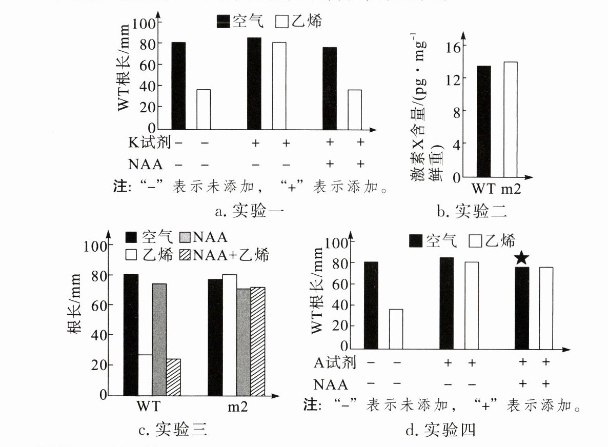 解析:(1)NAA是生长素类调节剂,K试剂抑制激素X的合成,由实验一结果可知,根伸长量情况为空气组中K试剂+NAA组<空白组<只加K试剂组,由于根对生长素比较敏感,说明只加K试剂组中激素X含量更少,激素X起到促进作用,所以推测激素X可能是生长素。(2)①由实验二的柱形图可知,该实验的自变量为水稻的种类(野生型和m2),因变量是激素X含量,结果m2中的激素X含量有所增加,因此实验二的目的是检测m2的突变基因是否与生长素合成有关。②生长素在根生长区的运输方向为极性运输,其运输方式为主动运输,实验三中使用了可自由扩散进入细胞的NAA,实验三野生型幼苗NAA组的根伸长量大于NAA+乙烯组,说明乙烯能抑制NAA的运输,故初步判断乙烯抑制根伸长与生长素运输有关。突变体m2的根伸长不受乙烯影响,由于生长素的运输需要载体蛋白,因此若要进一步验证该结论并检验m2的突变基因是否与此有关,可检测生长素载体蛋白基因的表达情况。③该实验有多个自变量,★所示组加入A试剂和NAA,可与单独使用进行对比,从而可作为实验组检测A试剂和NAA是否影响根伸长;