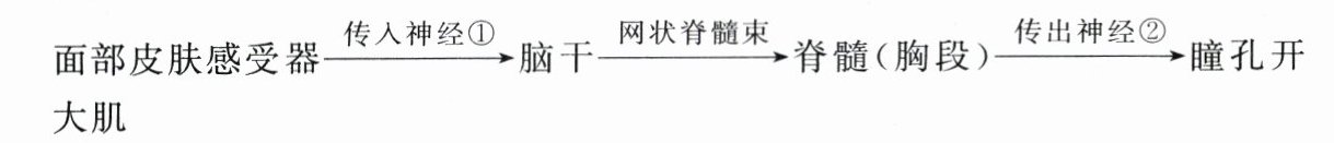 C 由题干“瞳孔开大肌是分布于眼睛瞳孔周围的肌肉,只受自主神经系统支配”可知,该反射不是靠人类意识控制的,属于非条件反射,A正确;与脑相连的神经为脑神经,含有传入神经和传出神经,传入神经①属于脑神经,B正确;躯体运动神经受意识支配,而瞳孔开大肌受自主神经系统支配,故传出神经②不属于躯体运动神经,C错误;反射需要完整的反射弧,若完全阻断脊髓(颈段)中的网状脊髓束,该反射不能完成,D正确。