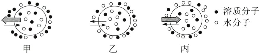 9. (2024·重庆九龙坡区三模)甲、乙、丙分别是三种哺乳动物的红细胞,研究人员将它们分别置于同一浓度的某水溶液中,并绘制出如下水分子的跨膜运输示意图,箭头方向表示水分子进出的方向,箭头粗细表示单位时间内水分子进出的多少。下列叙述正确的是 ( )