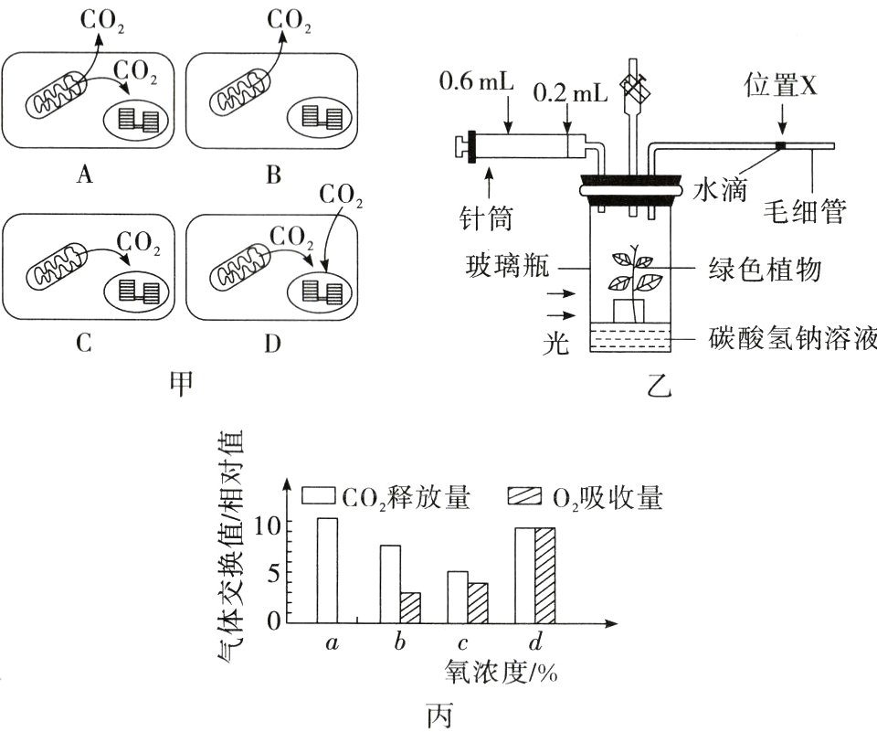 解析:(1)夏季中午光合作用强度大于呼吸作用强度,则需从外界吸收CO₂,可用甲图中的D表示。此时的细胞进行有氧呼吸,产生CO₂的场所是线粒体基质。植物要能正常生长,必须光合作用强度大于呼吸作用强度,图中A的呼吸作用强度大于光合作用强度,B只进行呼吸作用,C的呼吸作用强度等于光合作用强度,故长期处于A、B、C三种状态下,植物均无法正常生长。(2)①图中测定的是植物的表观光合速率,10 min的O₂释放量是0.6-0.2=0.4(mL),每小时的O₂释放量是0.4×6=2.4(mL)。②用这一方法测得的表观光合速率+呼吸速率=实际光合速率,所以这一方法测得的光合速率要比实际光合速率低,因为植物同时进行呼吸作用,消耗O₂。③该实验需要排除物理因素的干扰,所以需要设置一组对照实验:除去原装置中的植物,其他均不变。(3)若要测定呼吸速率,需要在装置中加入吸收CO₂的浓NaOH溶液或者KOH溶液,装置置于黑暗条件下,排除光合作用对实验的干扰。有氧呼吸中分解1分子葡萄糖需要消耗6分子O₂,同时产生6分子CO₂,消耗的O₂量和产生的CO₂量相等,由图丙可知,氧浓度为b时,O₂吸收量相对值为3,据此计算,消耗的葡萄糖量相对值是0.5,无氧呼吸产生的CO₂量相对值=8-3=5,无氧呼吸过程中产生的CO₂量是消耗葡萄糖的量的2倍,所以消耗的葡萄糖量相对值是2.5,即无氧呼吸消耗的葡萄糖量是有氧呼吸的5倍。该无氧呼吸的反应式为C₆H₁₂O₆$\xrightarrow{酶}$2C₂H₅OH+2CO₂+少量能量。