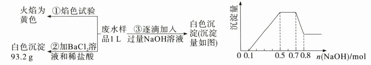 解析:无色废水中肯定不存在Fe³⁺,根据实验①确定存在Na⁺,根据实验②确定存在SO₄²⁻,根据实验③结合题图可知,溶液中有H⁺、NH₄⁺、Al³⁺、Mg²⁺,因为CO₃²⁻与H⁺、Al³⁺、Mg²⁺不能共存,所以无CO₃²⁻。n(SO₄²⁻)= 93.2 g / 233 g·mol⁻¹ = 0.4 mol,根据题图求出n(Al³⁺)=n[Al(OH)₃]=0.8 mol - 0.7 mol = 0.1 mol,n(NH₄⁺)=0.7 mol - 0.5 mol = 0.2 mol,n(H⁺)=0.1 mol,生成0.1 mol Al(OH)₃消耗0.3 mol NaOH,则生成Mg(OH)₂消耗的氢氧化钠为0.5 mol - 0.1 mol - 0.3 mol = 0.1 mol,即含有Mg²⁺的物质的量是0.05 mol。