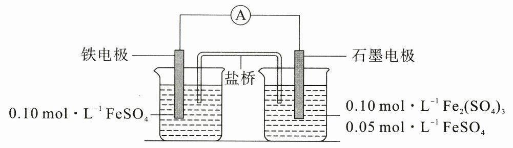 C 由题意分析,铁电极为负极,电极反应式为Fe - 2e⁻ = Fe²⁺,石墨电极为正极,电极反应式为Fe³⁺ + e⁻ = Fe²⁺。A项,Fe²⁺、Fe³⁺能与HCO₃⁻反应,Ca²⁺与SO₄²⁻不能大量共存,FeSO₄、Fe₂(SO₄)₃都属于强酸弱碱盐,水溶液呈酸性,酸性条件下NO₃⁻能与Fe²⁺反应,根据题意“盐桥中阴、阳离子不与溶液中的物质发生化学反应”,盐桥中阴离子不可以选择HCO₃⁻、NO₃⁻,阳离子不可以选择Ca²⁺,盐桥中阴、阳离子的迁移率(μ∞)应尽可能地相近,根据表中数据,盐桥中应选择KCl作为电解质,错误;B项,石墨电极为正极,电极反应式为Fe³⁺ + e⁻ = Fe²⁺,错误;C项,由题图知,右池中原c(Fe²⁺) : c(Fe³⁺) = 0.05 : 0.20,发生反应为Fe³⁺ + e⁻ = Fe²⁺,现c(Fe²⁺) : c(Fe³⁺) = 3 : 2,即c(Fe²⁺) : c(Fe³⁺) = 0.15 : 0.10,在此过程中c(Fe²⁺)增加了0.10mol·L⁻¹,转移的电子为0.10mol·L⁻¹,则由负极反应式Fe - 2e⁻ = Fe²⁺知,左池中c(Fe²⁺)增加了0.05mol·L⁻¹,即左池中c(Fe²⁺) = 0.15mol·L⁻¹,正确;D项,盐桥中的阴离子流向负极,则阴离子进入铁电极一侧溶液中,错误。