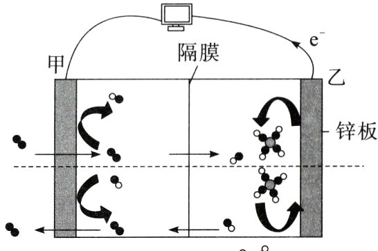 A项,从题图示外电路电子转移方向可以判断,甲为正极,乙为负极,故放电时甲的电势比乙高,正确;B项,从图示中可以看出负极的反应为Zn + 4OH⁻ - 2e⁻ = [Zn(OH)₄]²⁻,正确;C项,没有指明温度和压强,不能计算生成气体的体积,错误;D项,从图示中离子移动方向可知,该电池是二次电池,可以充电、放电,使用过程中不产生污染和废弃物,同时可以通过更换锌和空气电极来实现重复利用,D正确。