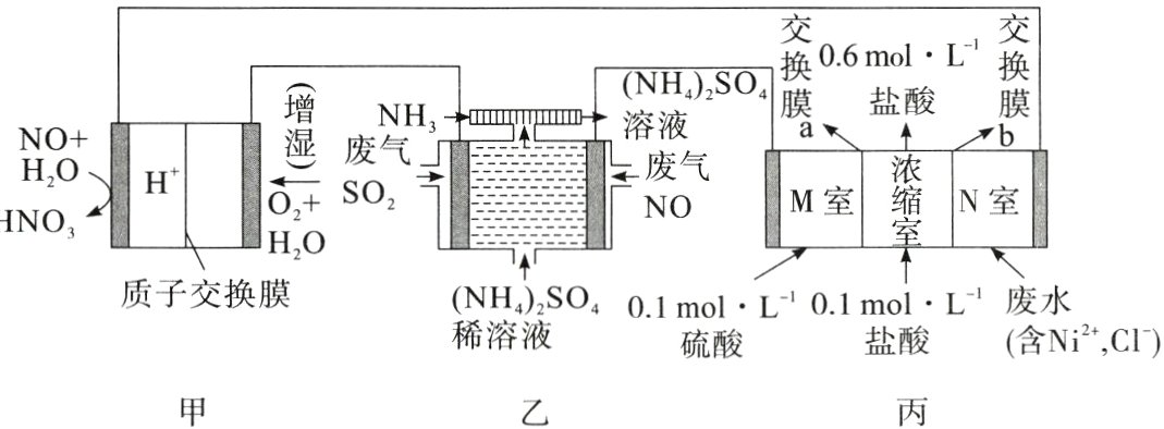 (2)乙池中通入废气SO₂的电极连接电源的正极,为阳极;阳极的二氧化硫发生氧化反应生成硫酸根离子,阴极的一氧化氮发生还原反应生成铵根离子,电池总反应的离子方程式为5SO₂ + 2NO + 8H₂O 电解 2NH₄⁺ + 5SO₄²⁻ + 8H⁺。
