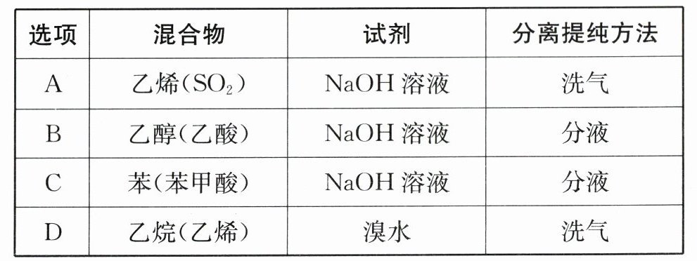 B SO₂与NaOH溶液反应生成Na₂SO₃和H₂O,乙烯与NaOH不反应,洗气可以分离,A正确;乙酸与NaOH溶液反应,乙醇溶于水,分液不能分离,B错误;苯甲酸与NaOH溶液反应生成苯甲酸钠和H₂O,苯与NaOH溶液不反应且不溶于NaOH溶液,混合液分层,分液可以分离,C正确;乙烯与溴水发生加成反应,乙烷不反应,可以通过盛有溴水的洗气瓶洗气进行分离提纯,D正确。