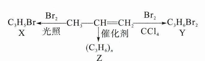 CH₃—CH = CH₂在光照条件下与Br₂发生—CH₃上的取代反应,生成CH₂Br—CH = CH₂(X);与Br₂的CCl₄溶液发生加成反应,生成CH₃—CHBr—CH₂Br(Y);在催化剂作用下发生加聚反应,生成