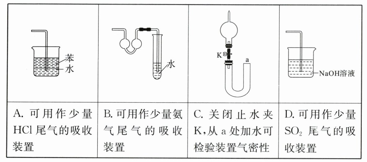 A HCl易溶于水,上层为水,下层为CCl₄时才能起到吸收尾气且防倒吸的作用,A错误。氨气极易溶于水,双球U形管可阻止水倒吸入反应容器中,B正确。关闭止水夹K,从a处加水,若装置气密性良好,则U形管左右两侧存在液面差,且一段时间内不改变,C正确。少量SO₂与NaOH溶液的反应速率不是很快,可以不考虑倒吸,D正确。