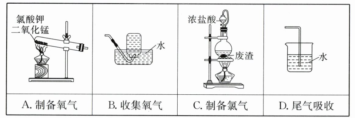 D 氯酸钾在二氧化锰催化下分解生成氯化钾和氧气,故A能达到目的;氧气不易溶于水,可用排水法收集氧气,故B能达到目的;二氧化锰和浓盐酸受热生成氯化锰、氯气和水,可制取氯气,故C能达到目的;氯气是有毒气体,水对其的吸收效果不好,其能与NaOH溶液反应,尾气吸收应该选用NaOH溶液,故D不能达到目的。