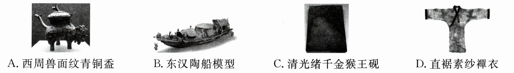 A 西周兽面纹青铜盉的材质为青铜,青铜属于合金,A符合题意;东汉陶船模型的材质为陶瓷,由硅酸盐制成,B不符合题意;清光绪千金猴王砚的材质为硅酸盐等无机非金属材料,C不符合题意;直裾素纱襌衣的主要成分为蛋白质,属于天然有机高分子材料,D不符合题意。