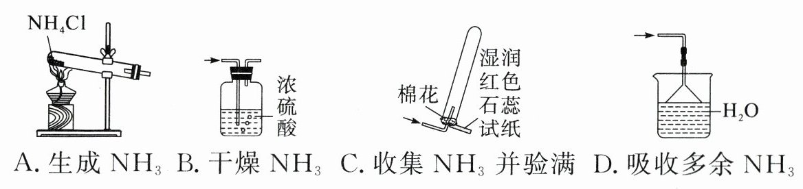 D 氯化铵受热分解生成HCl和氨,HCl和氨在试管口遇冷又会化合生成氯化铵,不能用加热氯化铵来制取氨,A错误;浓硫酸能与氨反应,不能用浓硫酸来干燥氨,B错误;氨的密度比空气的小,应该用向下排空气法收集氨,导管应该伸到试管底部,C错误;氨极易溶于水,尾气吸收应采取防倒吸的措施,D正确。