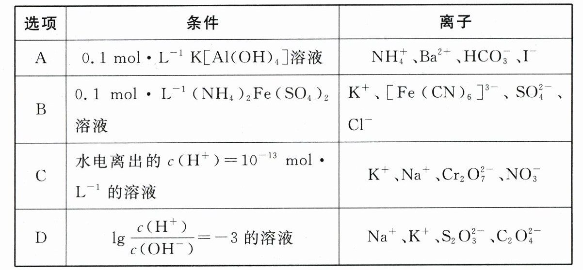 A项,[Al(OH)₄]⁻和HCO₃⁻因发生反应[Al(OH)₄]⁻ + HCO₃⁻ = Al(OH)₃↓ + CO₃²⁻ + H₂O而不能大量共存,不符合题意;B项,Fe²⁺与Fe(CN)₆³⁻、K⁺发生反应K⁺ + Fe²⁺ + [Fe(CN)₆]³⁻ = KFe[Fe(CN)₆]↓,不能大量共存,不符合题意;C项,水电离出的c(H⁺)=10⁻¹³ mol·L⁻¹的溶液,溶液可能呈酸性也可能呈碱性,Cr₂O₇²⁻在碱性条件下无法大量存在,不符合题意;D项,lg$\frac{c(H⁺)}{c(OH⁻)}$ = - 3的溶液呈碱性,碱性溶液中Na⁺、K⁺、S₂O₃²⁻、C₂O₄²⁻能大量共存,符合题意。