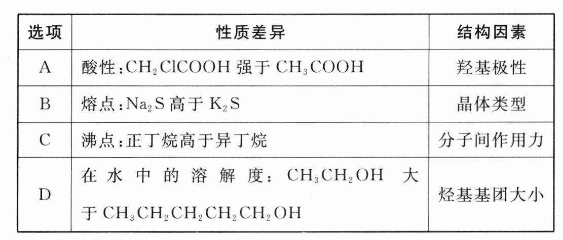 CH₂ClCOOH中的羟基极性强于乙酸,使得CH₂ClCOOH酸性强于乙酸,故A正确;硫化钠和硫化钾均为离子晶体,离子晶体的熔点与离子键的强弱有关,钠离子半径小于钾离子半径,钠离子与硫离子之间的离子键强于钾离子与硫离子之间的离子键,因此硫化钠的熔点高于硫化钾,故B错误;正丁烷和异丁烷均为分子晶体,分子晶体的熔沸点与分子间作用力有关,正丁烷的分子间作用力大于异丁烷,因此正丁烷的沸点高于异丁烷,故C正确;乙醇和CH₃CH₂CH₂CH₂CH₂OH均为极性分子,但是乙醇的烃基基团小于CH₃CH₂CH₂CH₂CH₂OH,因此乙醇在水中的溶解度大于CH₃CH₂CH₂CH₂CH₂OH,故D正确。