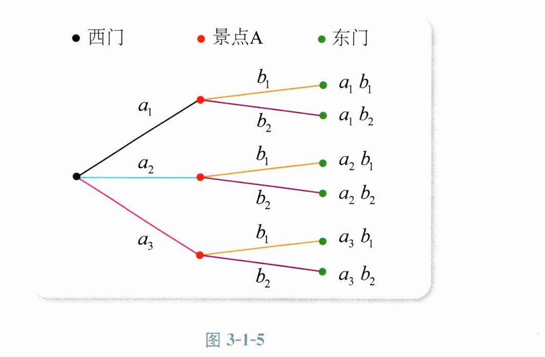 已知某公园的示意图如图3 - 1 - 4所示,其中从西门到景点A共有3条不同的路,从景点A到东门共有两条不同的路。王瑞从公园的西门进入公园后,想去A景点游玩,然后从东门出公园。只考虑路的选择,王瑞共有多少种不同的走法?你能用适当的符号表示出所有的情况吗?