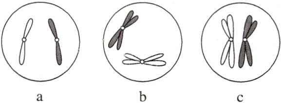 AD [a、b、c细胞中都有2条染色体,其中a细胞不含染色单体,b和c细胞都含有染色单体,A错误;a、b、c细胞中都有1对同源染色体,B正确;四分体是由同源染色体两两配对形成的,因此c细胞中有1个四分体,C正确;a细胞中有2个核DNA分子,b、c细胞中均有4个核DNA分子,D错误。]