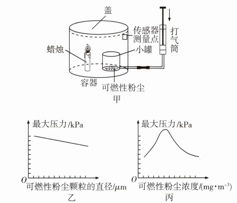8. (实验情境)兴趣小组同学采用图甲装置对可燃性粉尘爆炸进行探究,爆炸剧烈程度可用产生的最大压力衡量。下列相关说法正确的是( )