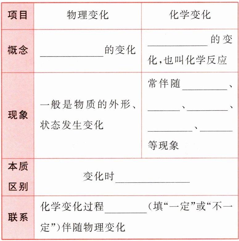 1. 没有生成新物质 生成新物质 发光 发热 颜色变化 产生气体 生成沉淀 有无新物质生成 一定
