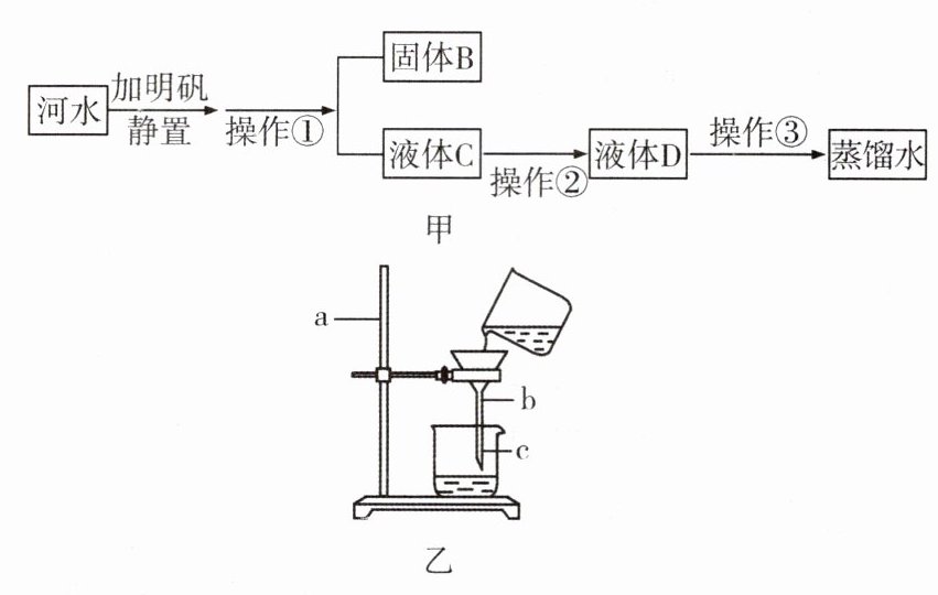 (2)操作①如图乙所示,仪器b的名称是________________。图乙中还缺少的一种仪器是________,其作用是________。装置安装还存在的一处错误是________________。操作①之后的水是________(填“纯净物”或“混合物”),理由是________________。操作①后发现液体C仍然浑浊,可能的原因是________________(写一条即可)。
