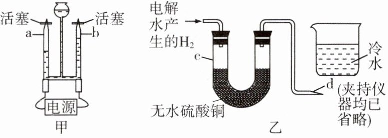 (2)科学家还用点燃氢气证明燃烧产物的方法,证实了水的组成。如图乙所示,将电解水产生的氢气直接缓缓地通过装有足量无水硫酸铜(提示:无水硫酸铜遇水变蓝色,可用来除去气体中的水蒸气)的仪器c,在导管口d 处点燃,然后把盛有冷水的烧杯置于如图所示的位置。实验过程中可以观察到的现象是______________________________。