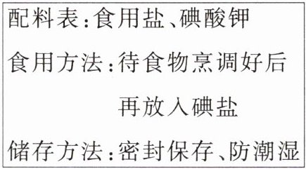 12. 科学思维 (2024·青岛市南区校级一模)碘元素(元素符号为I)具有预防和治疗甲状腺肿大的作用,人体缺碘时易患“大脖子病”。为了消除碘缺乏症,我国政府立法推行碘化食盐。碘化食盐简称碘盐,常见的是在食盐中加入一定量的碘酸钾。如图是某精制碘盐包装袋上的部分说明文字,请回答下列问题。