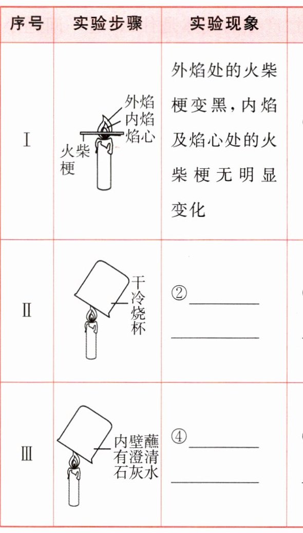 ①外焰温度最高 ②干冷的烧杯内壁有水雾生成 ③蜡烛燃烧生成水 ④澄清石灰水变浑浊 ⑤蜡烛燃烧生成二氧化碳