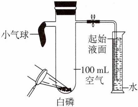 11. (实验情境)用来测定空气成分的方法有很多种,如图所示方法的化学原理是:磷 + 氧气$\xrightarrow{点燃}$五氧化二磷(五氧化二磷是一种白色粉末)。实验过程是利用放大镜聚焦太阳光引燃白磷,待燃烧停止并冷却至室温后,打开止水夹。下列选项关于该实验的说法,不正确的是( )