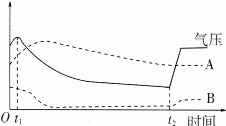 (3)下图是通过传感器测得的装置一中集气瓶内气体压强、温度及氧气浓度随时间变化的情况。图中表示温度随时间变化的曲线是______(填“A”或“B”)。t₂时进行的操作是____________________。