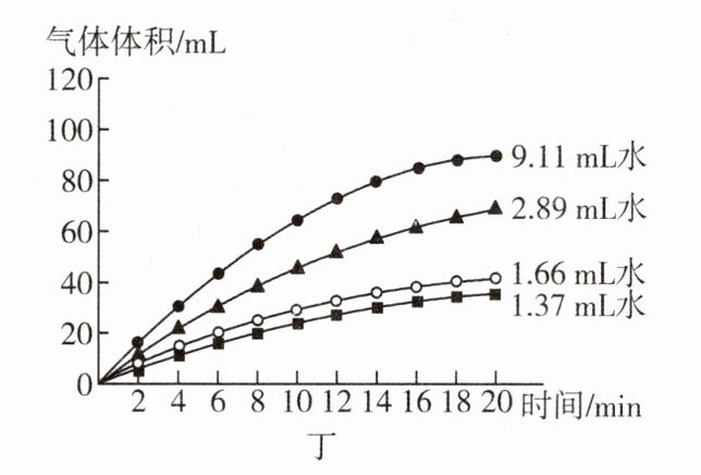 向锥形瓶中加入一定量的过碳酸钠、0.2 g MnO₂,再分别用不同体积的水进行实验。记录并处理20 min内数据如图丁。