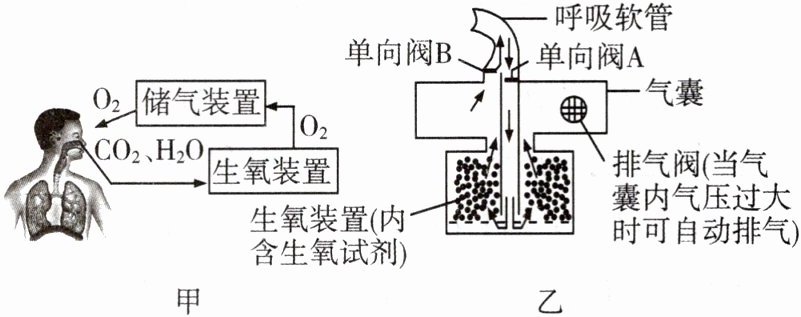 3. 小金设计了一款在缺氧环境或出现高浓度有毒有害气体环境下逃生时使用的自救呼吸器。其设计思路如图甲所示,自救呼吸器的结构如图乙所示(其中箭头方向表示气体流动方向)。