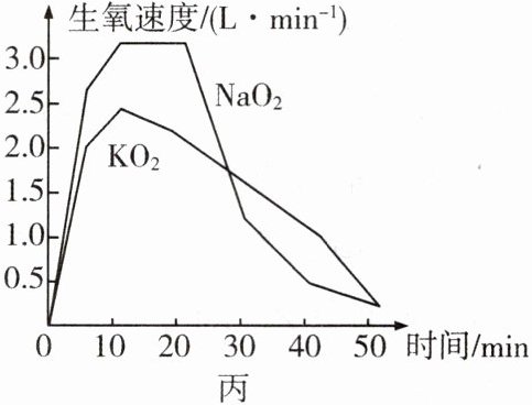 500 g超氧化钾(KO₂)和500 g超氧化钠(NaO₂)的生氧性能如图丙所示。小金依据人正常呼吸时需要生氧试剂的生氧速度不低于1 L/min,并结合自救呼吸器的结构和生氧试剂的生氧性能,选取了KO₂作为生氧试剂。选取KO₂的优点是____________________________。(写出1点即可)