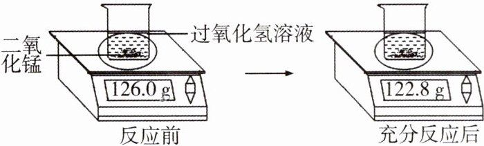 8. 取一定质量的过氧化氢溶液与二氧化锰制取氧气,反应前后,分别用电子秤称得烧杯连同其中物质的总质量,数据如图所示: