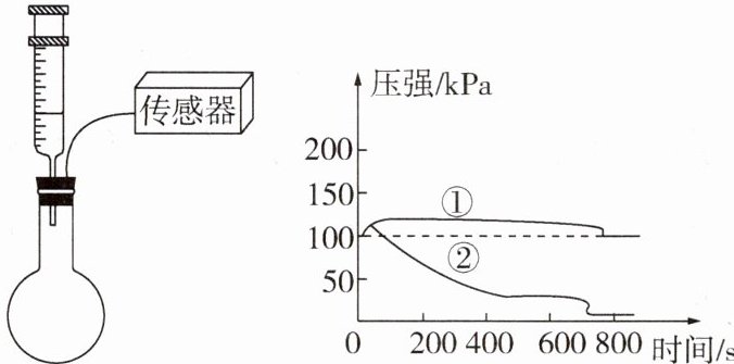 8. 在烧瓶中充满CO₂,通过注射器向瓶中分别加入等体积的水和澄清石灰水,利用传感器得到的气压变化对应如图曲线①和②。下列说法错误的是( )