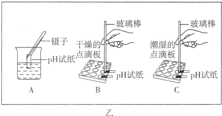 (3)图乙是三位同学分别测定土壤酸碱度的操作示意图,其中正确的是__________(填“A”“B”或“C”,下同),可能导致被测溶液的 pH 发生改变的错误操作是________。