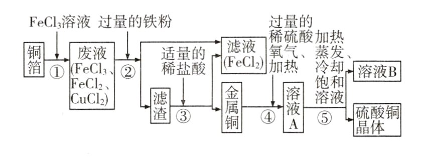 (1)步骤①所得的废液中只含有$FeCl_3$、$CuCl_2$、$FeCl_2$三种溶质,据此可判断步骤①中铜与$FeCl_3$反应生成的两种产物是________(写化学式)。