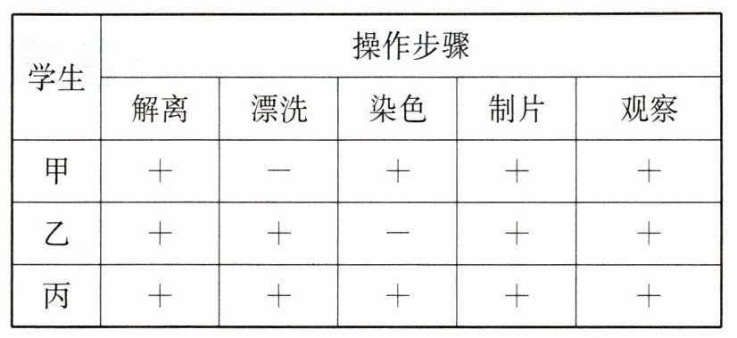 1. 在制作和观察植物细胞有丝分裂临时装片的活动中,甲、乙、丙三位同学剪取洋葱根尖后,立即进行如表所示的操作步骤。下列叙述错误的是 ( )