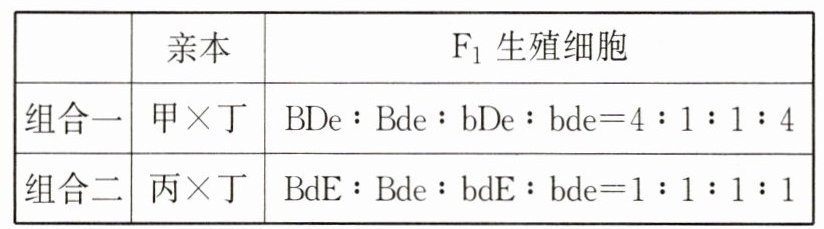 ACD 由组合一的结果可知,F1生殖细胞的基因型及比例不为1 : 1 : 1 : 1,故B/b和D/d位于同一对同源染色体上,A正确。组合一中得出结论:B/b和D/d位于同一对同源染色体上,不遵循自由组合定律;对等位基因E/e而言,又因为F1产生的生殖细胞只含有e基因,因此组合一利用F1自交无法验证基因的自由组合定律,B错误。由分析可知,B/b和E/e位于两对同源染色体上,遵循自由组合定律。实验二中F1(BbddEe)自交所得的F2中纯合子所占的比例为4/16=1/4,所以F2中杂合子所占的比例为1-1/4=3/4,C正确。可通过观察F1花粉粒的形状和花粉遇碘液的颜色来验证基因的自由组合定律,因此两亲本杂交后F1中应同时含有D/d和E/e,符合条件的组合有乙×丁和甲×丙,D正确。