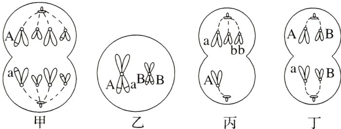 D 图甲是有丝分裂后期图像,图中基因a出现的原因是基因突变,A错误;图乙是减数分裂Ⅱ图像,图中基因a出现的原因可能是同源染色体上的等位基因随着非姐妹染色单体之间的互换而发生交换,也可能是基因突变,B错误;丙细胞产生的2个子细胞中,一个多一条染色体,一个少一条染色体,属于染色体数目变异,且基因a出现的原因可能是同源染色体上的等位基因随着非姐妹染色单体之间的互换而发生交换,也可能是基因突变,C错误;图丁是减数分裂Ⅱ后期图像,图中基因a出现的原因可能是染色体互换,也可能是基因突变,基因突变的频率是很低的,最可能的原因是四分体时期发生了非姐妹染色单体之间的互换,因此基因a的出现最可能与基因重组有关,D正确。