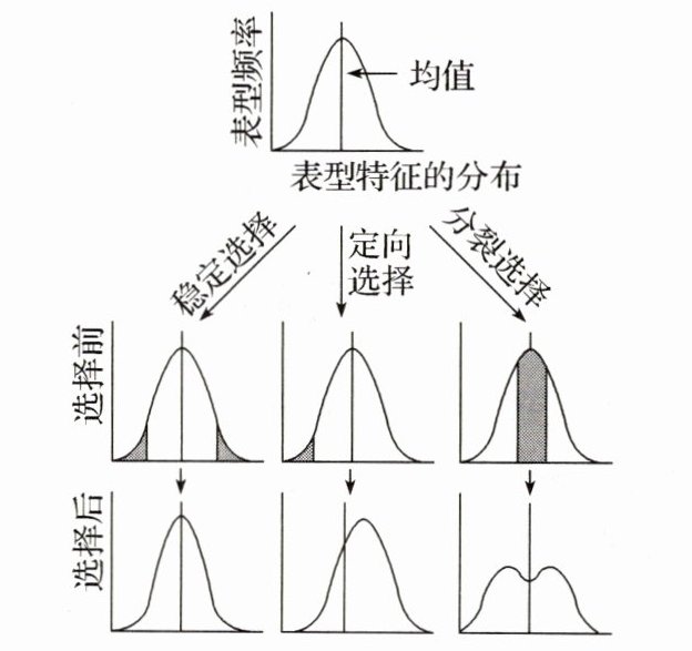A 据题图分析,定向选择可以定向地改变种群的基因频率,使种群中某些基因频率定向增加,会使种群表型均值发生偏移,A错误、C正确;根据图示信息,稳定选择淘汰了表型频率低的个体,有利于表型频率高的个体,B正确;分裂选择淘汰了表型频率高的个体,使其频率下降,D正确。
