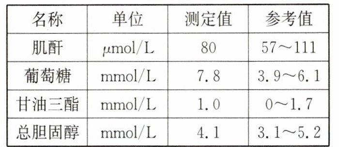AC 肌酐是蛋白质代谢的产物,分布在血浆中,属于内环境的组成成分,A错误;内环境的各种组成成分的含量均有一个正常的范围,B正确;该同学血浆中葡萄糖的含量高于正常值,故该同学的组织细胞对葡萄糖的摄取速率可能较低,C错误;在人体内,胆固醇可参与血液中脂质的运输,D正确。