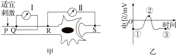 2.图甲为研究神经细胞膜电位变化的实验装置,两个神经元以突触联系,并有电表Ⅰ(两电极位于Q点位置的膜外和膜内)、Ⅱ(R处和S处电极分别位于膜外和膜内),给予适宜刺激后,电表Ⅰ测得电位变化如图乙所示,下列分析正确的是 ( )