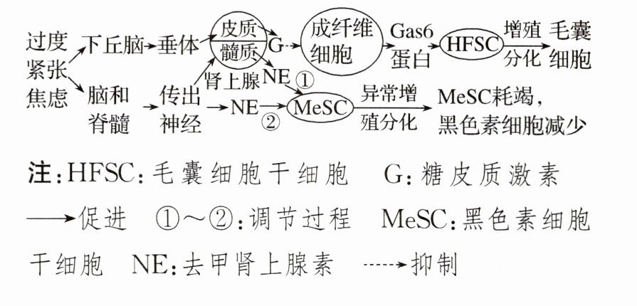 4. 过度紧张、焦虑等刺激不仅会导致毛囊细胞数量减少引起脱发,也会导致黑色素细胞减少引起头发变白。利用黑毛小鼠进行研究得出的相关调节机制如图所示。