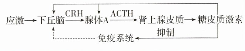 糖皮质激素是一种免疫抑制剂,由肾上腺皮质分泌,可抑制淋巴细胞增殖。人和动物在精神紧张或受到创伤等应激刺激时,糖皮质激素的含量会迅速增加。相关调节过程如图所示(CRH:促肾上腺皮质激素释放激素,ACTH:促肾上腺皮质激素)。回答下列问题。