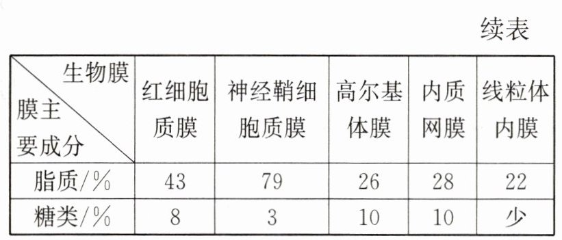 解析:生物膜主要由磷脂和蛋白质组成,磷脂分子可以侧向自由移动,大多数蛋白质也能运动,因此蛋白质和脂质的运动构成膜的流动性,A正确;糖蛋白与细胞识别作用有密切关系,因此高尔基体和内质网之间的信息交流与二者膜上的糖类有关,B正确;哺乳动物成熟的红细胞没有高尔基体,C错误;蛋白质的种类和数量越多,细胞膜的功能越复杂,由表格内容可知,线粒体内膜的蛋白质相对含量最高,其功能最复杂,神经鞘细胞质膜的蛋白质相对含量最低,其功能最简单,D正确。